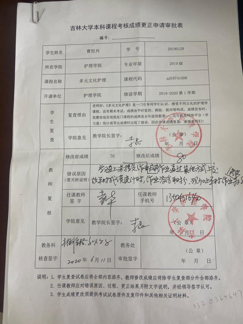 根据《关于进一步明确本科生课程考核等有关问题的通知》(校教字〔2018〕47号)文件有关精神,现对成人免费网站 2019级曹恒兴同学(学号:29190128)2019-2020-1学期课程成绩更正如下: